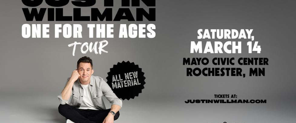 (Rochester, Minn.) September 9, 2025 – Magician and comedian Justin Willman will bring his One for the Ages Tour to Mayo Civic Center on Saturday, March 14, 2026 at 7:00 p.m. A local presale runs from Thursday, September 11 at 10:00 a.m. through Friday, September 12 at 9:00 a.m. with code LIVE. Tickets go on sale Friday, September 12 at 10:00 a.m. at the Mayo Civic Center Box Office and Ticketmaster.com. Box Office hours are Fridays from 10:00 a.m. – 4:00 p.m.