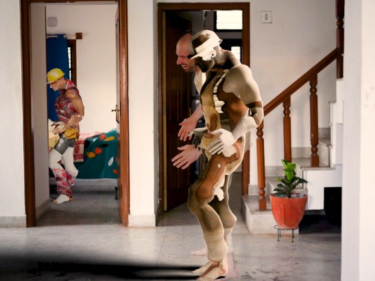Image: Ryan Woodring, spot healing 2024. Single channel video. 9 minutes. Size variable. Alt id: An HD (16x9) video still depicting three men in just about the same standing side-pose in a well-lit apartment. 2 of the characters are 3D-modeled construction workers identifiable by hard-hats and tool belts while the third is a white male in his thirties who tries imitating their posture.